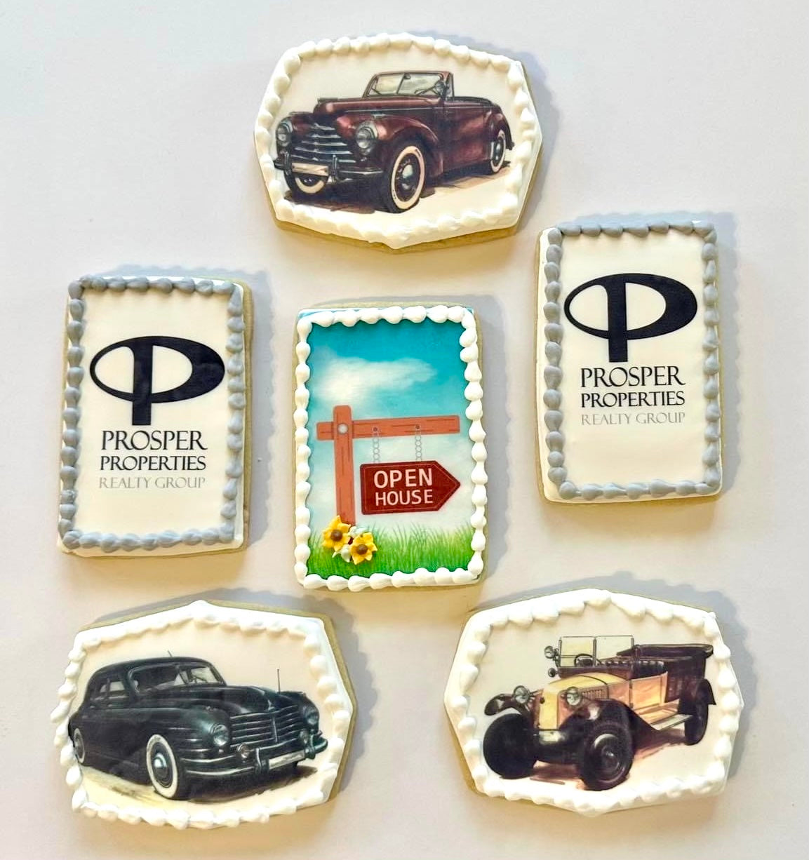 We created custom logo cookies for a realty group showcasing the customer's love of vintage cars.